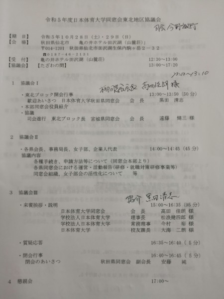 今年度の日本体育大学同窓会東北地区協議会が秋田県仙北市で開催され、澤田会長、廣谷事務局長、田代女子会長、野呂女子会の4名が出席しました。